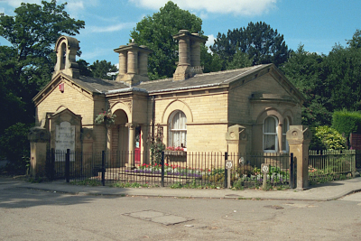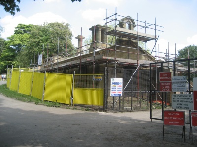 This photo shows the Lodge at the entrance to Roberts Park clad in scaffolding during its refit. Taken May 2009.