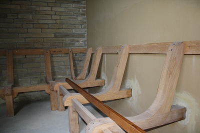 This shows the bench inside the East Shelter in the process of being built.