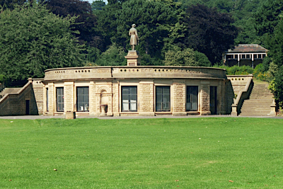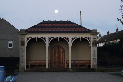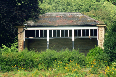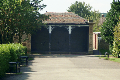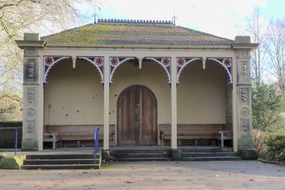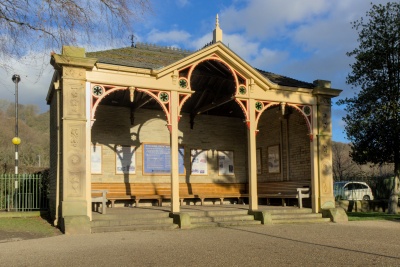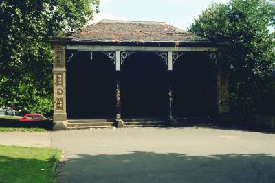 Park shelter. 1870, probably by Lockwood and Mawson. Hammer-dressed stone, ashlar dressings, wooden entrance surround, Welsh blue slate roof. Pilaster strips with carved floral decoration, moulded cornice. Set between are 3 wooden divisions a replacement of the original but not conforming to the original design. Hipped roof. Part of the scheme of the model village of Saltaire.