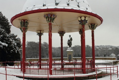 This photo shows the newly erected and painted bandstand with the statue of Titus Salt behind on the flat roof balustrade of the Half Moon Cafe.