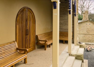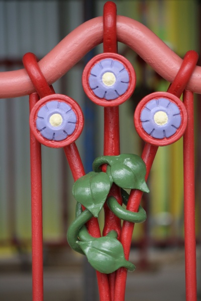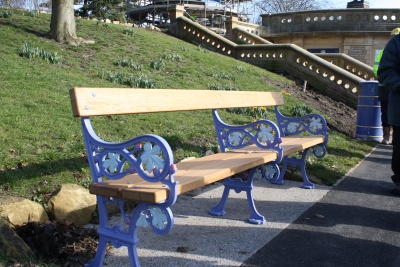 The colours used in painting the arches of the shelters were based on the colours of the tiles in the Halfmoon Cafe, as were the railings, benches lining the paths and the litter bins.