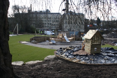 The metal benches along the path,seen in the 1999 photo, have been replaced with timber and wrought iron benches that will be similar to those originally in the park.