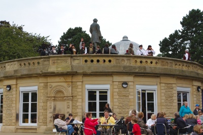 The photo above shows the Half Moon Cafe and balustrade. This was taken on 15 Sept 2012 during the Saltaire Festival. A group of Steam Punk can be seen on the balustrade.