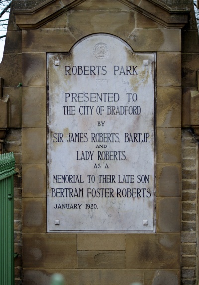 Roberts Park Presented to the city of Bradford by Sir James Roberts Bart JP and Lady Roberts as a Memorial to their late son Bertram Foster Roberts January 1920