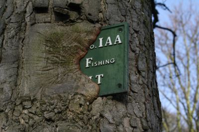 The sign is slowly being consumed by the tree