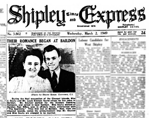 Shipley Times and Express - Wednesday 02 March 1949 THEIR ROMANCE BEGAN AT BAILDON During the Nazi occupation of the Channel Islands, Miss J. Coutu and Mr. Louis Keutzer found refuge for five years in Baildon. Mr. Keutzer worked for the Airedale Combing Company, and joined in local football. Miss Coutu worked at Baildon Post Office, and, in off-duty hours, entertained with "The Sparklets." They first met at Baildon. Now, from the Channel Islands, comes the announcement that Mr. Keutzer and Miss Coutu are engaged to be married. (Photo by Happy Snaps Guernsey, C.I)