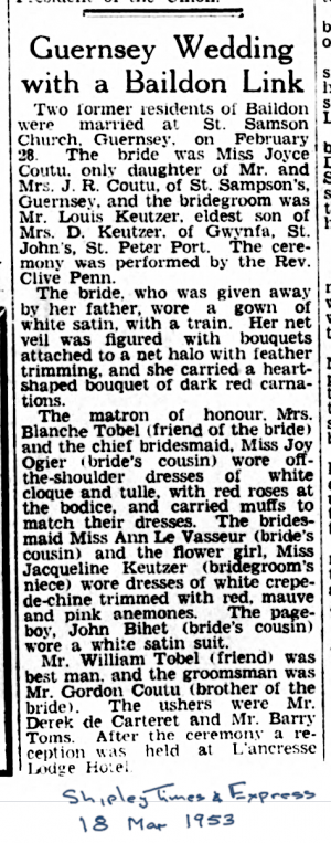 Shipley Times and Express - Wednesday 18 March 1953 Guernsey Wedding with a Baildon Link Two former residents of Baildon were married at St. Samson Church, Guernsey, on February 28. The bride was Miss Joyce Coutu, only daughter Mr. and Mrs. J. R. Coutu, of St. Sampson’s, Guernsey, and the bridegroom was Mr. Louis Keutzer, eldest son of Mrs. D. Keutzer. of Gwynfa. St. John s, St. Peter Port. The ceremony was performed the Rev. Clive Penn.