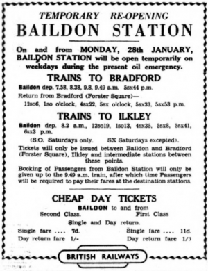 Shipley Times and Express - Wednesday 23 January 1957 BAILDON STATION TO BE REOPENED As a result of the oil and petrol shortage, British Railways have announced the re-opening of Baildon Station temporarily as from Monday, January 28, for local bookings to Bradford and Ilkley and intermediate stations. The station was closed in January 1953 for economic reasons, but since petrol rationing was introduced some local residents have been pressing for its reopening. The limes of trains will be:— To Shipley and Bradford 7-58, 8-38, 9-8, 9-49 a.m. and 5-44 p.m. (Saturdays excepted). To Ilkley - 8-2 am. From Bradford to Baildon only 12-8 p.m. (Saturday only): 1-0 p.m. (Saturday only); and 4-22 p.m., 5-0 p.m., 5-33 p.m.. 5-53 pm. (all Saturdays excepted).