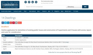 In April 2016 a page on the Construction Index suggests a value for property, with outline planning permission for 9 apartments and 5 houses, of £1,100,00 - £1,300,000.